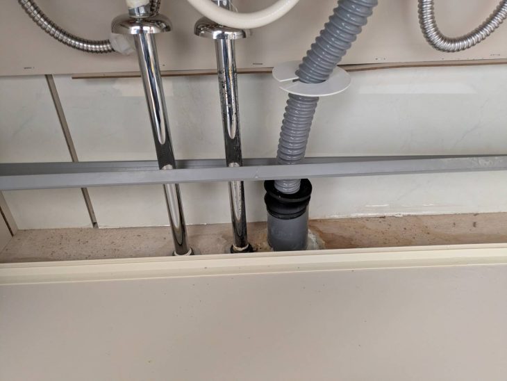 蛇腹の排水パイプが、完全に納まっていませんでした。