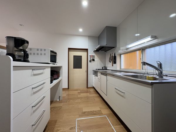 今回の工事では、壁側にシンクとコンロ、レンジフードを設け、カウンター側に電気製品などの収納カウンターを設けます。